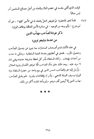 في هذه الأثناء قدم أصحاب البشارات بما ينبئ عن وصول الصّاحب وحصول المآرب. فلحق في أعقابهم بخدمة العتبة السلطانية، وحكى ما حدث من أحداث وإيجاب. وكان السلطان يأمر كل لحظة بتشريفة جديدة ويثني ثناء لا مزيد عليه. وبعد ذلك جاوز شأن الصاحب قلّة شواهق الكمال وذروة الجلال. وأرسل إليه هو والصّاحب شمس الدين في يوم واحد من حضرة السلطنة دواة الوزارة وسيف النيابة الذهبي، وأمر له بإقطاعات وفيرة. فلم يقبل الصّاحب مهذب الدين إلا أربعين ألف درهم، ولم يأخذ لنفسه أكثر من ذلك.