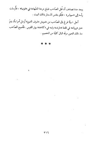 وبعد مدة تصادف أن قتل الصّاحب فبلغ درجة الشّهادة في «قونية»، فأرسلت رأسه إلى «سيواس»، فعلّق بنفس المسمار بذلك البيت.