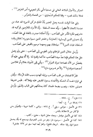وأرسل جلال الدين قراطاي وابن الطوسي إلى الصّاحب: حتى ولو وصل مثل هذا الحكم فإننا نعدّ سيدنا الصّاحب حاكما وقدوة لنا. إلا أنّه ينبغي عليه أن يتفضّل من الآن فصاعدا بترك التبوّش (¬3)، ويأتي إلى الدّيوان بغلام أو غلامين أحدهما «دواتدار» (¬4) والآخر «سرموزه دار» (¬5).