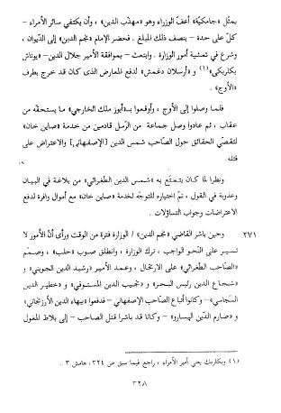 يمثّل «جامكيّة» أعفّ الوزراء وهو «مهذّب الدين»، وأن يكتفي سائر الأمراء- كلّ على حدة- بنصف ذلك المبلغ. فحضر الإمام «نجم الدين» إلى الدّيوان، وشرع في تمشية أمور الوزارة. وابتعث- بموافقة الأمير جلال الدين- «يوتاش بكلربكى» (¬1) و «أرسلان دغمش» لدفع المعارض الذى كان قد خرج بطرف «الأوج».