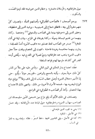فعقد اجتماع بدار الحكم في اليوم التالي، وادّعى عليه على ملأ من الناس كلّ ذلك حرفا بحرف، وأثبته بالحجج والبراهين، فلم يحر جوابا، وألزم. حتى إنّ الأمير «جلال الدين» أوصل خطاب السّباب له إلى قاف وطا (¬3) ورفع دواة الوزارة ليضربه بها، فمنعه الأمراء الآخرون من ذلك. وانتهى ذلك الاجتماع بهذا الخصام. وأخذ أمر الصّاحب «الطّغرائي» في التراجع.