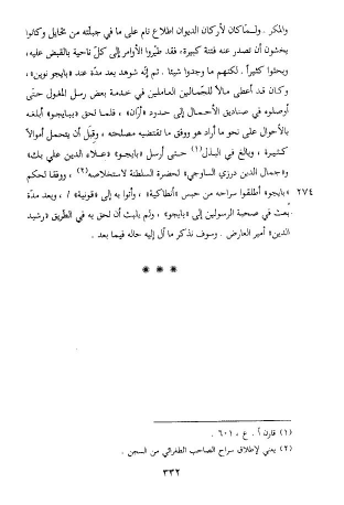 والمكر. ولمّا كان لأركان الديوان اطلاع تام على ما في جبلّته من تحايل وكانوا يخشون أن تصدر عنه فتنة كبيرة، فقد طيّروا الأوامر إلى كلّ ناحية بالقبض عليه، وبحثوا كثيرا. لكنهم ما وجدوا شيئا. ثم إنّه شوهد بعد مدّة عند «بايجو نوين»، وكان قد أعطى مالا للجّمالين العاملين في خدمة بعض رسل المغول حتّى أوصلوه في صناديق الأحمال إلى حدود «أرّان»، فلما لحق «ببايجو» أبلغه بالأحوال على نحو ما أراد هو ووفق ما تقتضيه مصلحته، وقبل أن يتحمل أموالا كثيرة، وبالغ في البذل (¬1) حتى أرسل «بايجو» «علاء الدين علي بك» و «جمال الدين درزي الساوجي» لحضرة السلطنة لاستخلاصه (¬2)، ووفقا لحكم «بايجو» أطلقوا سراحه من حبس «أنطاكية»، وأتوا به إلى «قونية» /، وبعد مدّة بعث في صحبة الرسولين إلى «بايجو»، ولم يلبث أن لحق به في الطّريق «رشيد الدين» أمير العارض. وسوف نذكر ما آل إليه حاله فيما بعد.