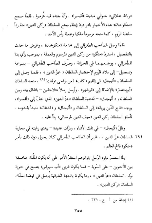 ولما استمرّ توارد الرّسل وتواترهم استقرّ الأمر على أن يكون الملك مناصفة بين الأخوين- على السّوية- فما يكون غربى «آب سيواس» يصبح في حوزة نوّاب السلطان «عزّ الدين»، وما يكون بالجهة الشرقية يجعل في قبضة تملّك السلطان «ركن الدين».