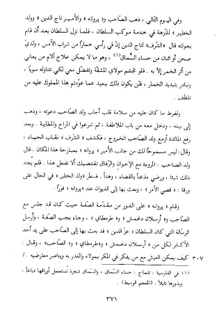 وفي اليوم التّالي، ذهب الصّاحب و «پروانه» والأمير تاج الدين «وولد الخطير» للنّزهة في خدمة موكب السلطان، فلما نزل السلطان بعد أن قام بجولته قال «الشّرف» لتاج الدين إنّ في رأسي خمارا من شراب الأمس، ولديّ صحن أو اثنان من حساء السّماق (¬1)، وهو ما لا يمكن علاج آلام من يعاني من أثر الخمر إلّا به. فلو تجشم مولاي المشقّة وتفضّل معي لكي نتناوله سويا، ونبادر بتبديد الخمار، فلن يكون ذلك ببعيد عما عوّدتم هذا المملوك عليه من تلطّف.