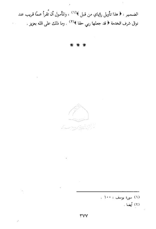 الضمير: هذا تَأْوِيلُ رُءْيايَ مِنْ قَبْلُ (¬1)، والمأمول أن تقرأ عمّا قريب عند نوال شرف الخدمة قَدْ جَعَلَها رَبِّي حَقًّا (¬2). وما ذلك على الله بعزيز.