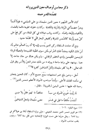 كان الأمير الشّهير «معين الدين سليمان بن علي الديلمي» طودا أشمّا وبحرا خضما في الرّزانة والدّراية والكفاية. وكانت خلواته مملوءة دائما بالعلماء والأتقياء والزّهاد والعبّاد. وكانت رواتب صلاته في كل البلاد من كل فجّ على كلّ يتيم وأرملة كالشّمس المشرقة وكفيض البحار التّي لا تحدّها حدود.