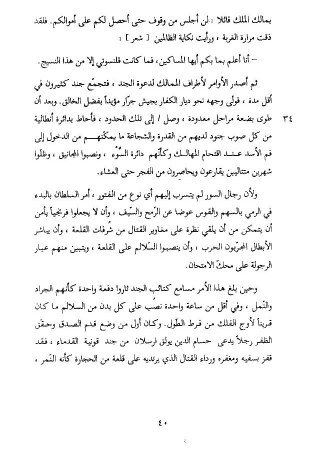 ولأن رجال السور لم يتسرب إليهم أي نوع من الفتور، أمر السلطان بالبدء في الرمي بالسهم والقوس عوضا عن الرّمح والسّيف، وأن لا يجعلوا فرنجيا يأمن أن يتمكن من أن يلقي نظرة على مغاوير القتال من شرفات القلعة، وأن يباشر الأبطال المجرّبون الحرب، وأن ينصبوا السّلالم على القلعة، ويتبين منهم عيار الرجولة على محكّ الامتحان.