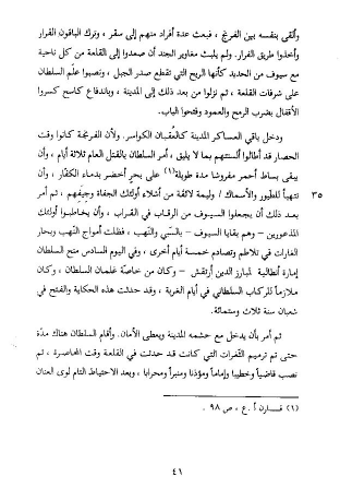 وألقى بنفسه بين الفرنج، فبعث عدة أفراد منهم إلى سقر، وترك الباقون القرار وأخذوا طريق الفرار. ولم يلبث مغاوير الجند أن صعدوا إلى القلعة من كل ناحية مع سيوف من الحديد كأنها الريح التي تقطع صدر الجبل، ونصبوا علم السلطان على شرفات القلعة، ثم نزلوا من بعد ذلك إلى المدينة، وباندفاع كاسح كسروا الأقفال بضرب الرمح والعمود وفتحوا الباب.