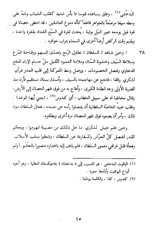 / وحين شاهد (السلطان) تطاول الرّمح وتعدّى السهم ووقاحة الدّرع وسلاطة السّيف وخشونة السّنان وملامة العمود الثّقيل سلّ حسام الإباء لقطع الدعاوي وفصل الخصومات، ووصل وسط المعركة إلى قلب العدو فرأى لشكري واقفا، فامتنع عن مهاجمته بالسيف، وأمسك بسنان مستقيم فأراه منذ الضربة الأولى وجه الطامة الكبرى، وأطاح به من فوق ظهر الحصان إلى الأرض، وقال مخاطبا له على سبيل الخطاب: أي كندوس (¬2)، (يعني أيها الوغد).