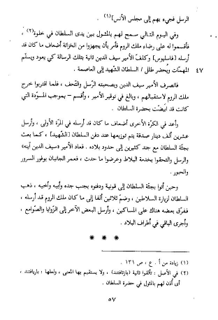 وفي اليوم التالي سمح لهم بالمثول بين يدى السلطان في خلوة (¬2)، فأقسموا له على رضاء ملك الروم فأمر بأن يجهزوا من الخزانة أضعاف ما كان قد أرسله [فاسليوس] وكلفّ الأمير سيف الدين ثانية بتلك الرسالة كي يعود ويسلّم المهمّات ويحضر طلل/ السلطان الشّهيد إلى العاصمة.