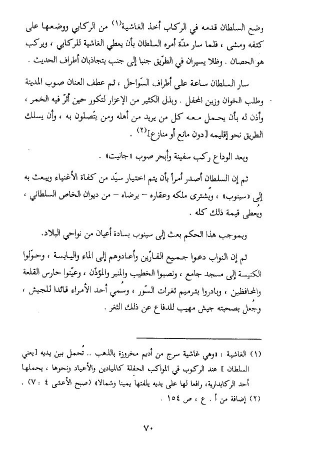 وضع السلطان قدمه في الركاب أخذ الغاشية (¬1) من الركابي ووضعها على كتفه ومشى، فلما سار مدّة أمره السلطان بأن يعطي الغاشية للركابي، ويركب هو الحصان. وظلا يسيران في الطّريق جنبا إلى جنب يتجاذبان أطراف الحديث.