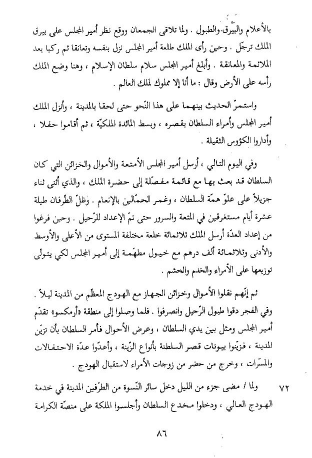 واستمرّ الحديث بينهما على هذا النّحو حتى لحقا بالمدينة، وأنزل الملك أمير المجلس وأمراء السلطان بقصره، وبسط المائدة الملكيّة، ثم أقاموا حفلا، وأداروا الكؤوس الثقيلة.