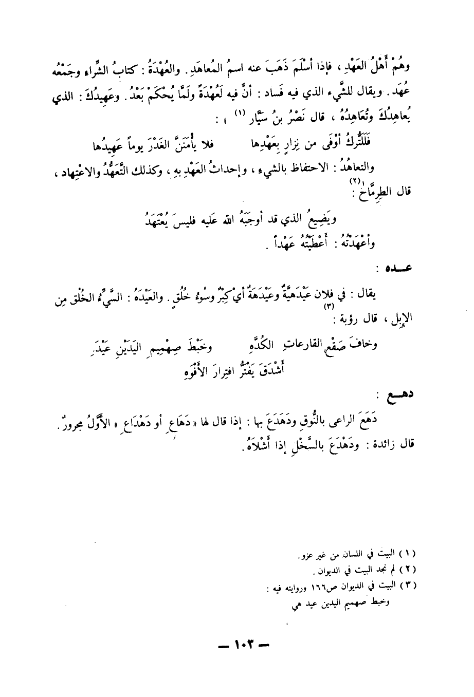 وهُمْ أهْلُ العَهْدِ، فإذا أسْلم ذهب عنه اسمُ المُعاهَدِ. والعُهْدَةُ: كتابُ الشِّراءِ وجمْعُه عُهَد. ويقال للشَّيء الذي فيه فساد: أنَّ فيه لَعُهْدَةً ولَمَّا يُحْكَمْ بَعْدُ وعَهِيدُكَ: الذي يُعاهِدُك وتُعَاهِدُهُ قال نصر بن سيار «1» :
