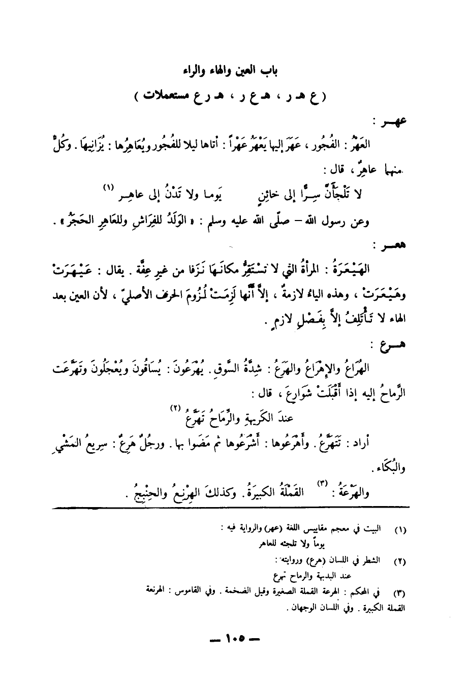 باب العين والهاء والراء (ع هـ ر، هـ ع ر، هـ ر ع مستعملات)