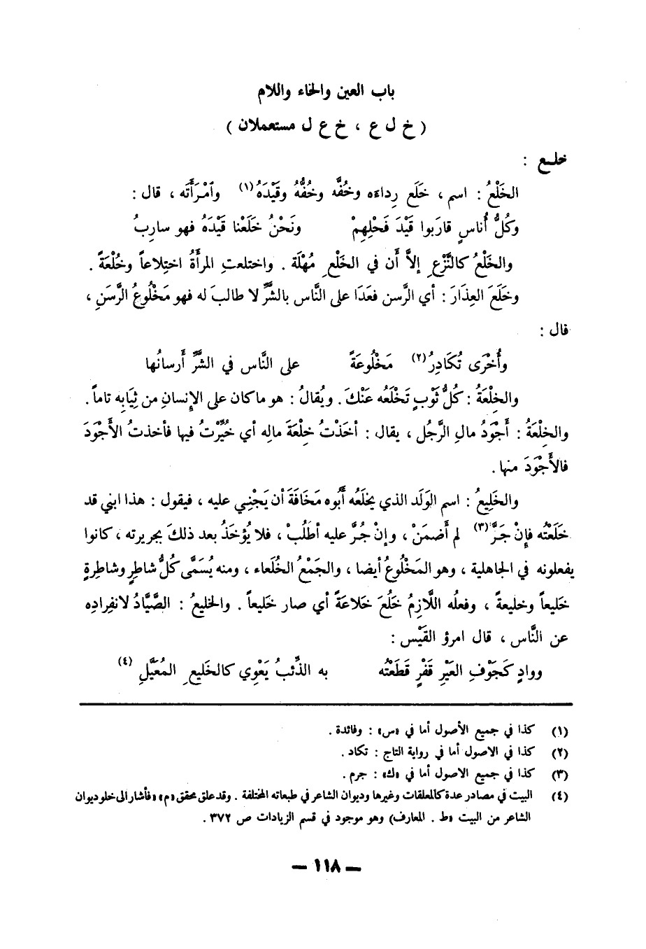 والخِلْعَةُ: كُلُّ ثَوْبٍ تَخْلَعُه عنْك. ويُقالُ: هو ما كان على الإنسان من ثِيابِه تاماً. والخِلْعَةُ: أجْودُ مالِ الرَّجُل، يقال: أخذْتُ خِلْعَةَ مالِه أي خُيِّرْتُ فيها فأخذتُ الأجْود فالأجْود منها. والخَلِيعُ: اسم الولد الذي يخلَعُه أبُوه مخافة أن يَجْنِي عليه، فيقول: هذا ابني قد خَلَعْتُه فإنْ جَرَّ «3» لم أَضَمنْ، وإنْ جُرَّ عليه أطلبْ، فلا يُؤخذُ بعد ذلك بجريرته، كانوا يفعلونه في الجاهلية، وهو المَخْلُوعُ أيضاً، والجَمْعُ الخُلَعاء، ومنه يُسمَّى كلُّ شاطِرٍ وشاطِرةٍ خَليعاً وخليعةً، وفعلُه اللَّازِمُ خَلُعَ خَلاعَةً أي صار خَليعاً. والخليعُ: الصَّيادُ لانفِرادِه عن الناس، قال امرؤ القيس: