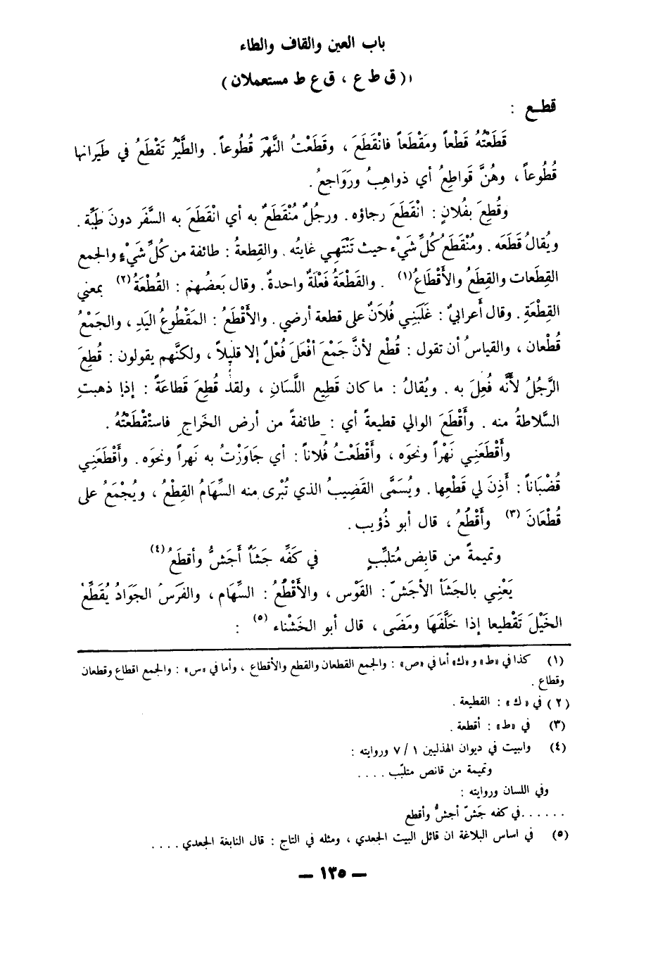 قطع: قَطَعْتُهُ قَطْعاً ومَقْطَعاً فانْقَطَعَ، وقَطَعْتُ النَّهْرَ قُطُوعاً. والطَّيرُ تَقْطَعُ في طيرانها قُطُوعاً، وهُنَّ قَواطِعُ أي ذواهبُ ورواجعُ. وقُطِعَ بفُلانٍ: انْقَطَعَ رجاؤه. ورجلٌ مُنقطعٌ به أي انْقطع به السَّفَر دون طيِّة. ويقال قَطَعَه. ومُنْقطعُ كُلِّ شيْء حيث تنْتهِي غايتُه. والقِطعةُ: طائفة من كل شيء والجمع القِطَعات والقِطَعُ والأقْطَاعُ «1» . والقَطْعَةُ فعْلةٌ واحدةٌ. وقال بعضُهم: الْقٌطَعَةُ «2» بمعنى القِطْعَةِ. وقال أعرابيٌ: غلبنِي فُلانٌ على قطعة أرضي. والأَقْطَعُ: المَقْطُوعُ اليدِ والجمعُ قُطْعان، والقياس أن تقول: قُطْع لأن جمع أفْعَلَ فُعْلٌ إلا قليلاً، ولكنهم يقولون: قُطِعَ الرَّجُلُ لأنه فُعِلَ به. ويقال: ما كان قَطِيع اللَّسَانِ، ولقد قُطِعَ قَطاعَةً: إذا ذهبتِ السلاطة منه. وأقْطَعَ الوالي قطيعةً أي: طائفةً من أرض الخَراجِ فاستْقْطَعْتُهُ. وأَقْطَعَنِي نهراً ونحوه، وأَقْطَعْتُ فُلاناً: أي جَاوَزْتُ به نهراً ونحوه وأقْطَعَنِي قُضْبَاناً: أذن لي قَطْعِها. ويُسمَّى القَضِيبُ الذي تُبْرى منه السِّهَامُ القِطْعُ، ويجمع على قُطْعَانَ «3» وأقْطُعُ، قال أبو ذؤيب:
