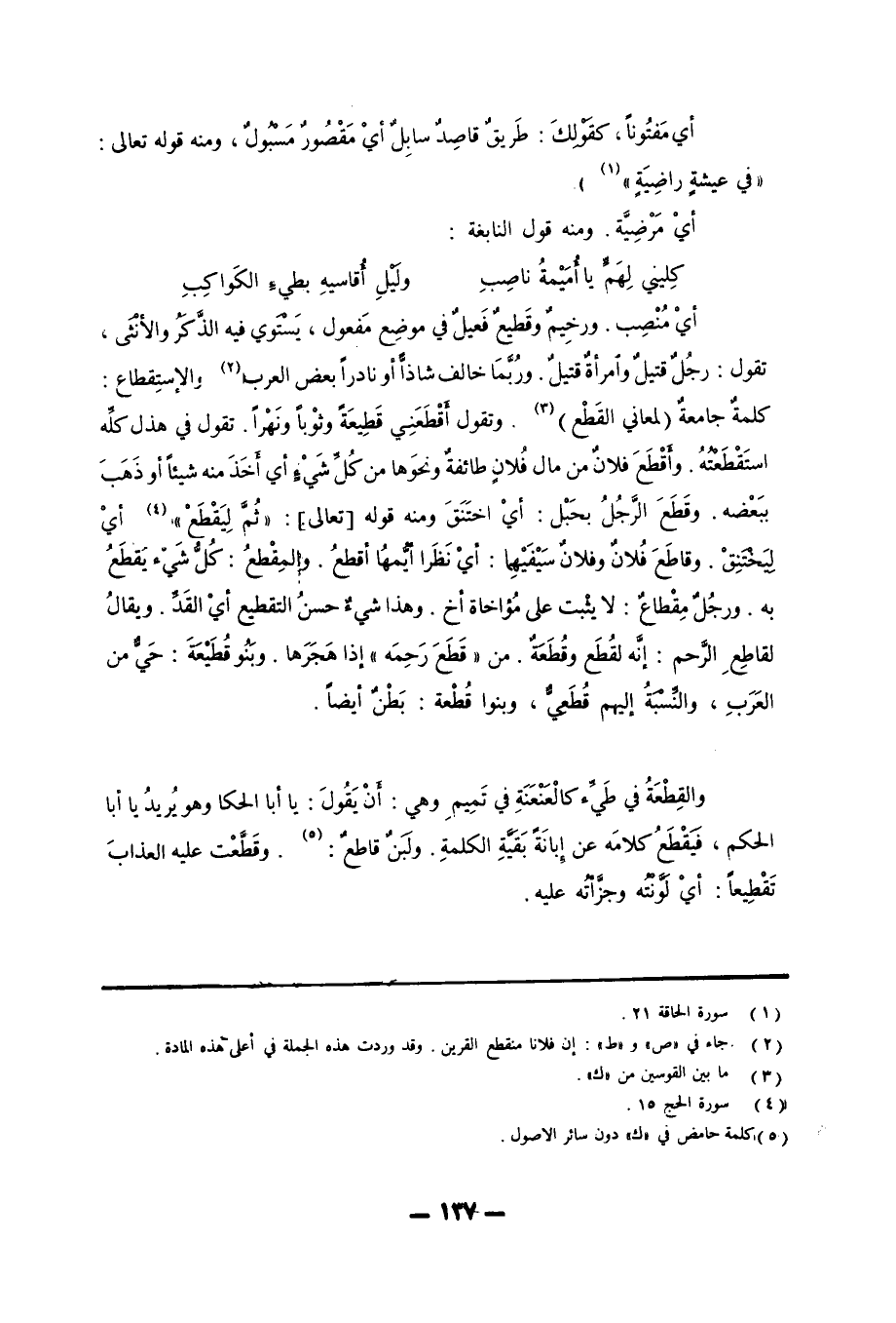 «4» أي لِيَخْتَنِقْ. وقاطَعَ فلانٌ وفلانٌ سَيْفَيْهِما: أي نَظَرا أيُّهمُا أقطعُ. والمِقْطعُ: كُلُّ شيء يُقْطَعُ به ورجُلٌ مِقْطاعٌ: لا يثْبت على مُؤاخاة أخ. وهذا شيءٌ حسن التقطيع أي القَدِّ. ويقالُ لقاطِعِ الرَّحم: إنه لقُطَع وقُطَعَةٌ. من قَطَعَ رَحِمَه إذا هجرها. وبَنُو قُطَيْعَةَ: حيٌ من العَرَبِ، والنِّسبةُ إليهم قُطَعِيُّ، وبنوا قُطْعة: بَطْنٌ أيضاً. والقِطْعَةُ في طَيِّء كالْعَنْعَنَةِ في تَمِيمِ وهي: أن يَقُولَ: يا أبا الحكا وهو يُريدُ يا أبا الحكم، فَيَقْطَعُ كلامه عن إبانَةً بَقَيَّةِ الكلمة. ولَبَنٌ قاطعٌ: «5» وقَطَّعْت عليه العذاب تَقْطِيعاً: أي لَوَّنْتُه وجزَّأتُه عليه.
