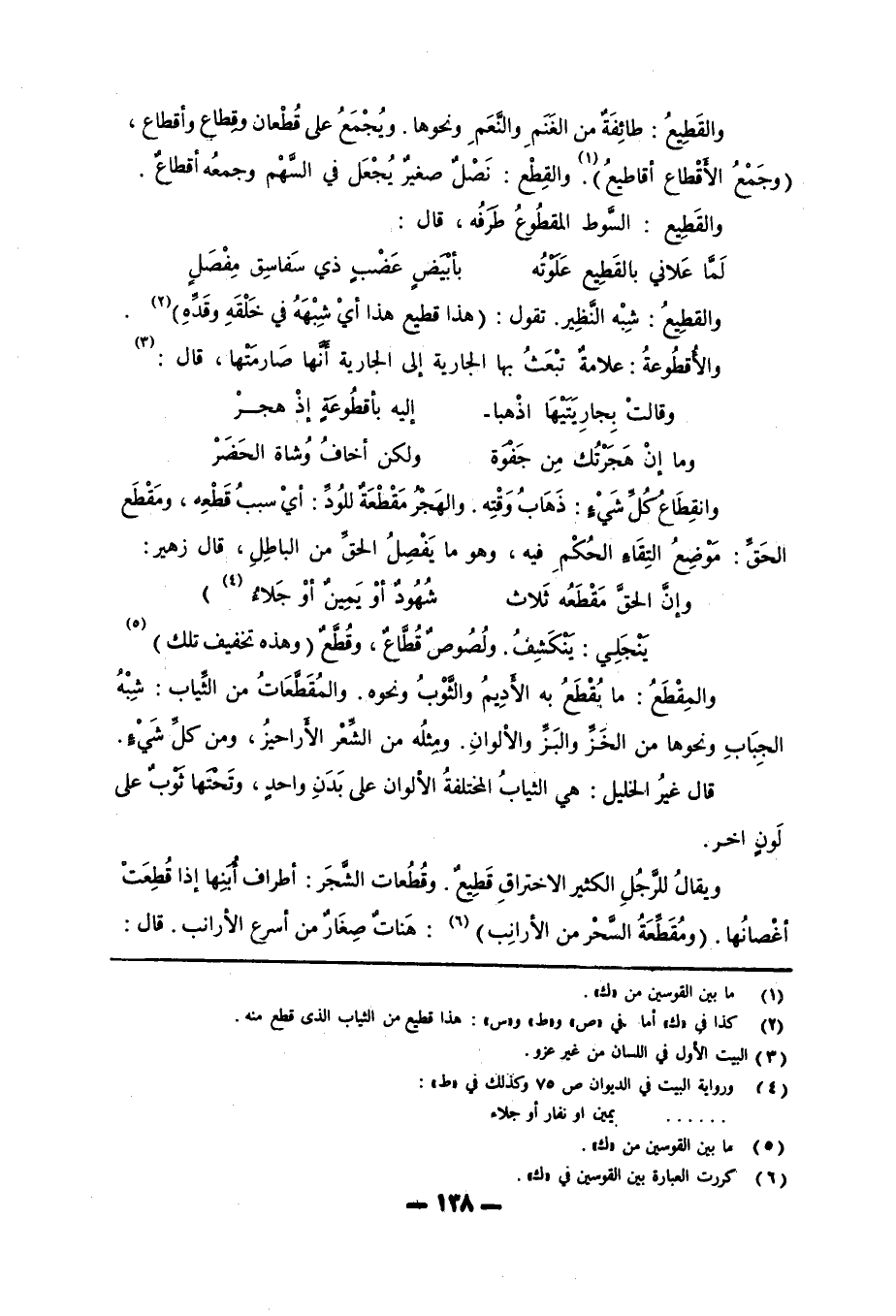 يَنْجَلِي: يَنْكَشِفُ. ولُصُوصٌ قطَّاعٌ، وقُطَّعٌ (وهذه تخفيف تلك) «5» والمِقْطَعُ: ما يُقْطَعُ به الأدِيمُ والثَّوْبُ ونحوه. والمُقَطَّعَاتُ من الثياب: شِبْهُ الجِبَابِ ونحوها من الخَزِّ والبَزِّ والألوان. ومثله من الشِّعْر الأراحيزُ، ومن كل شيءٍ. قال غيرُ الخليل: هي الثيابُ المختلفةُ الألوان على بَدَنٍ واحدٍ، وتحتْها ثَوْبٌ على لَوِنٍ اخر. ويقالُ للرَّجُل الكثير الاختراقِ قَطِيعٌ وقُطُعات الشَّجَر: أطراف أُبَنِها إذا قُطِعَتْ أغْصانُها. (ومُقَطِّعَةُ السَّحْر من الأرانِب) «6» : هناتٌ صِغَارٌ من أسرع الأرانب. قال: