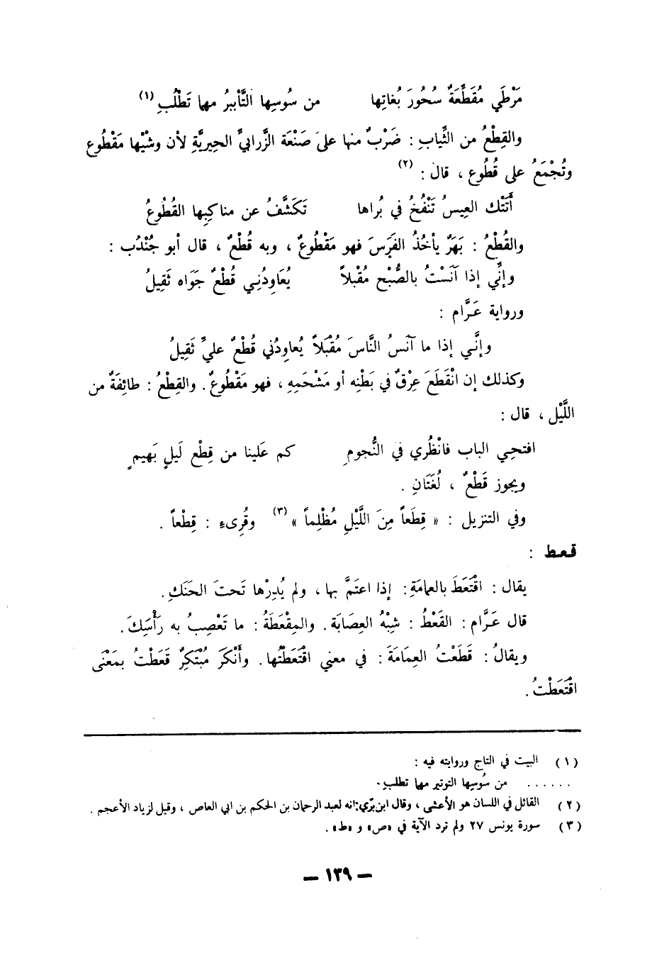 والقِطْعُ من الثِّيابِ: ضَرْبٌ منها على صَنْعَة الزَّرابيَّ الحِيريَّة لأن وشْيِها مَقْطُوع وتجمعُ على قُطُوع، قال «2»
