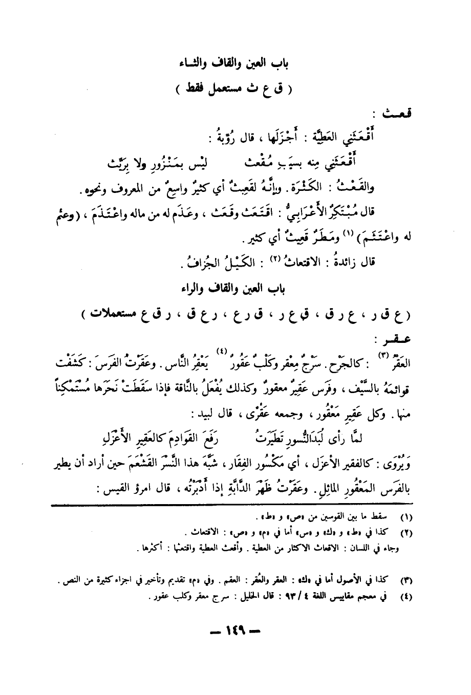 (4) في معجم مقاييس اللغة 4/ 93: قال الخليل: سَرْجٌ مِعْقر وكَلْبٌ عَقُورٌ.