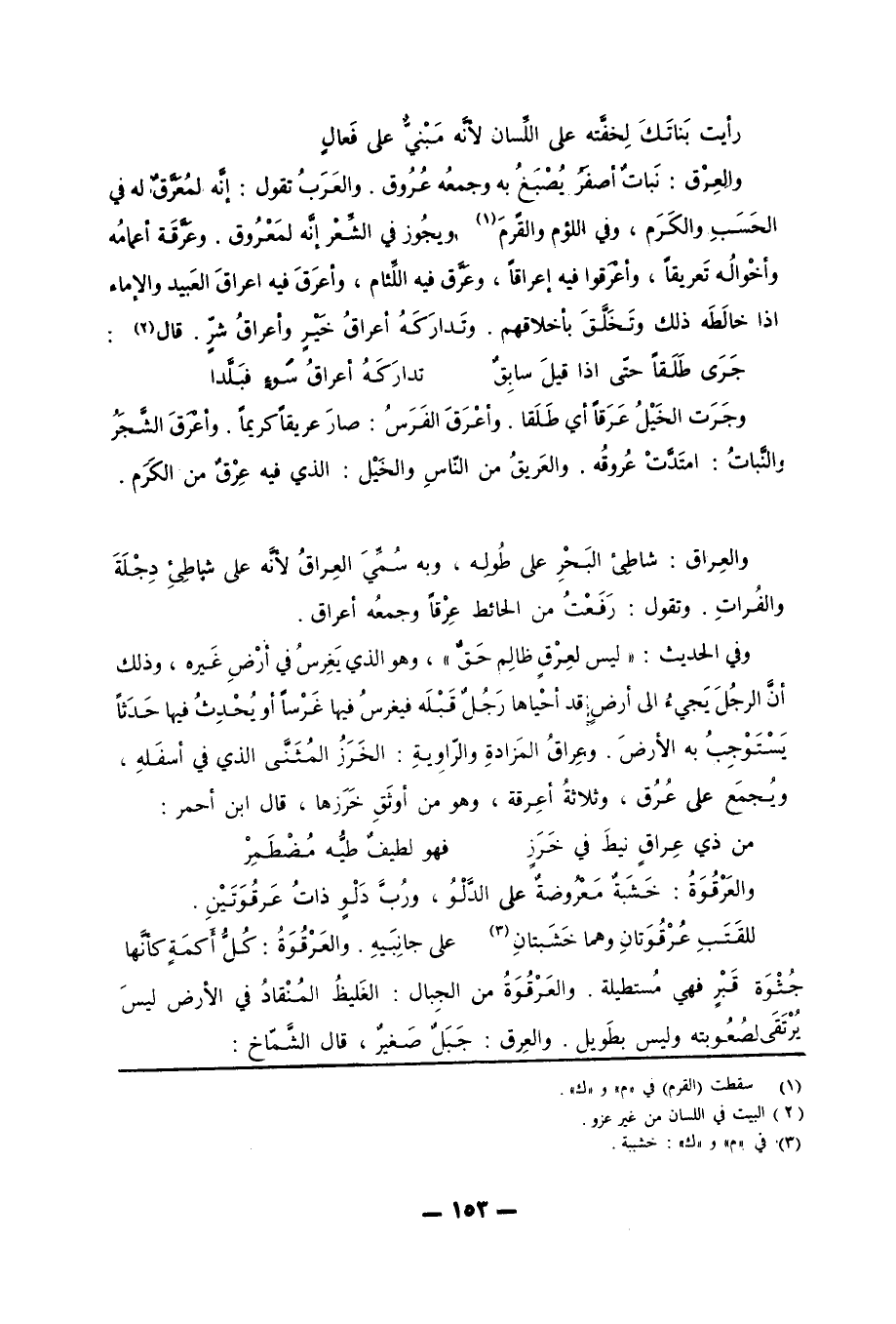 رأيت بَناتَكَ لِخفَّته على الِّلسان لأنه مَبْنيُّ على فَعالٍ والعِرْق: نَباتٌ أصفَرُ يُصْبَغُ به وجمعه عُرُوق. والعرب تقول: إنه لمُعَرَّقٌ له في الحَسَبِ والكَرَم، وفي اللؤم والقرم «1» ويجُوز في الشِّعْر إنَّه لمَعْرُوق. وعَرَّقَة أعمامهُ وأخْوالُه تَعريقاً، وأعْرَقوا فيه إعراقاً، وعَرَّق فيه اللئام، وأعرق فيه إعراقَ العَبيد والإماء إذا خالَطَه ذلك وتَخَلَّقَ بأخلاقهم. وتَدارَكَهُ أعراقُ خيرٍ وأعراقُ شرٍ. قال «2» :