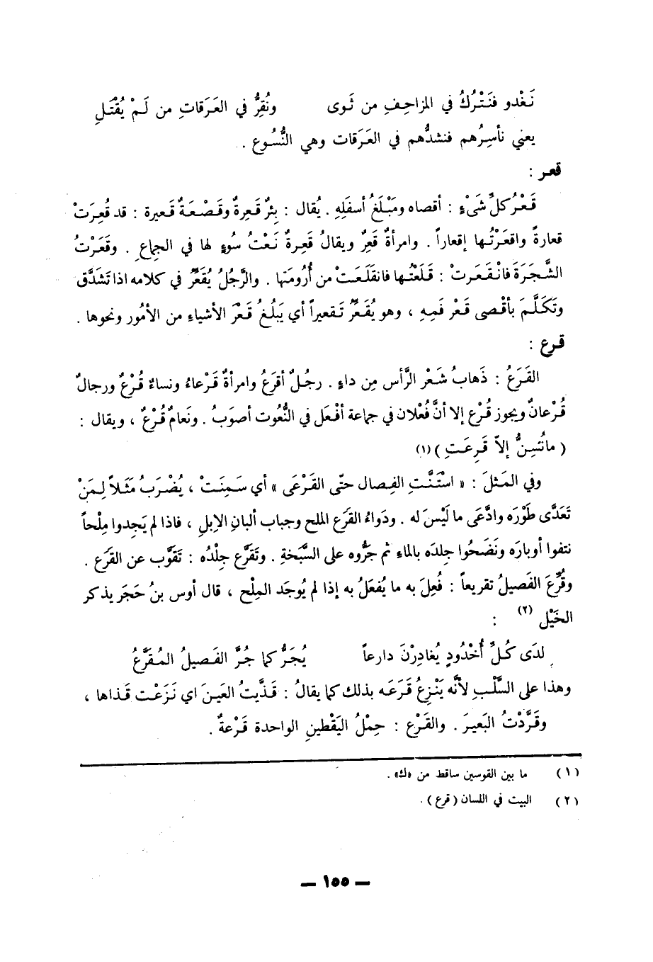 قرع: القَرَعُ: ذَهابُ شعر الرَّأس مِن داءٍ. رجُلٌ أقرَعُ وامرأةٌ قَرْعاءُ ونساءٌ قُرْعٌ ورجالٌ قُرْعانٌ ويجوز قُرْع إلا أنَّ فُعْلان في جماعة أفْعَل في النَّعُوت أصوبُ. ونَعامٌ قُرْعٌ، ويقال: (ما تسن إلا قَرِعَتِ) «1» وفي المثل: اسْتَنَّتِ الفِصال حتى القَرْعَى أي سَمِنَتْ، يُضْرَبُ مثلاً لِمْنْ تَعَدَّى طَوْرَه وادَّعى ما لَيْسَ له. ودَواء القَرَع الملح وجباب ألبانِ الإِبلِ، فإذا لم يَجِدوا مِلْحاً نتفوا أوبارَه ونَضَحُوا جِلدَه بالماء ثم جَرُّوه على السَّبَخِة. وتَقَرَّع جِلْدُه: تَقَوَّب عن القَرَع. وقُرِّعَ الفَصيلُ تقريعاً: فُعِلَ به ما يُفعَلُ به إذا لم يُوجَد الملح، قال أوس بن حَجَر يذكر الخيل «2» :