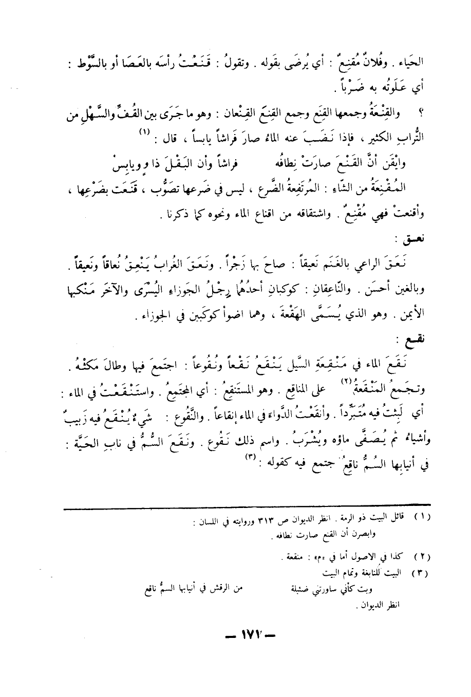 نقع: نَقَعَ الماء في مَنْقِعِةَ السَّيل يَنْقَعُ نَقْعاً ونُقُوعاً: اجتمع فيها وطال مَكثْهُ. وتجمعُ المَنْقَعةُ «2» على المناقِع. وهو المستَنقٍعُ: أي المجتَمِعٌ. واسَتْنَقْعتُ في الماء: أي لَبِثتُ فيه مُتَبَرَّداً. وأنقَعْتُ الدواء في الماء إنقاعاً. والنَّقُوع: شَيءٌ يُنْقَعُ فيه زَبيبٌ وأشياءُ ثم يُصَفَّى ماؤه ويُشْربُ. واسم ذلك نَقُوع. ونَقَعَ السُّمُّ في ناب الحيَّة: في أنيابِها السُمُّ ناقع اجتمع فيه كقوله «3» .