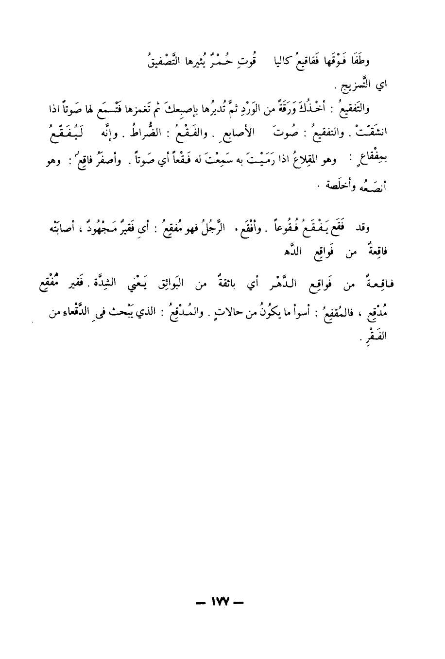أي التمزيج. والتَفقيعُ: أخْذُكَ وَرَقَةً من الوَرْدِ ثم تُديرُها بإصبِعكَ ثم تَغمزها فَتْسمَع لها صَوتاً إذا انشَقّتْ. والتفقيعُ: صوت الأصابع. والفَقْعُ: الضُّراطُ. وإنه لَيُفَقّعُ بمِفْقاعٍ: وهو المقِلاعُ إذا رَمَيْتَ به سمعت له فقعا أي صوتاً. وأصفَرُ فاقِعٌ: وهو أنصَعُه وأخلَصه. وقد فَقَع يَفْقَعُ فُقُوعاً. وأفْقَع، الرَّجُلُ فهو مُفقِعُ: أي فَقيرٌ مَجْهُودٌ، أصابَتْه فاقِعةٌ من فَواقِع الدهر فاقِعةٌ من فَواقِع الدَّهْر أي بائقةٌ من البَوائِق يعني الشدة. فَقير مُفْقِع مُدْقِع، فالمفقع: أسوأ ما يكوُنُ من حالاتٍ. والمُدْقِعُ: الذي يَبْحث في الدَّقْعاءِ من الفَقْرِ.