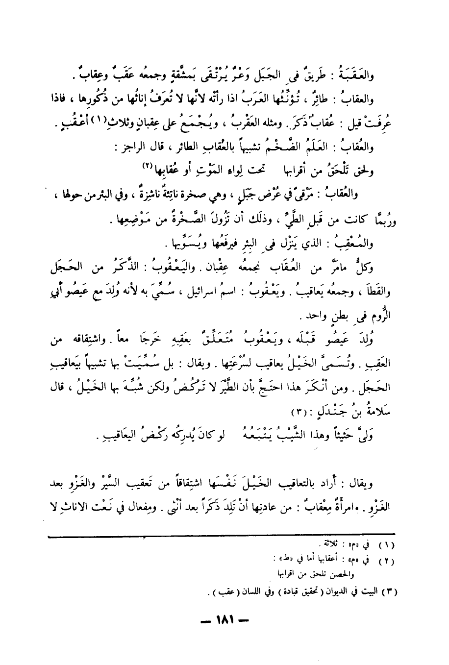 والعُقابُ: مَرْقىً في عُرْض جَبَلٍ، وهي صخرة نائتة ناشِزةٌ، وفي البئر من حولها، ورُبمَّا كانت من قَبلِ الطَّي، وذلك أن تَزُولَ الصَّخْرةٌ من مَوْضِعِها. والمُعْقِبُ: الذي يَنْزل في البِئِر فيرفَعُها ويُسَوِّيها. وكل ما مَرَّ من العُقَاب نجمعه عِقْبان. واليَعْقُوبُ: الذَّكَرُ من الحَجَل والقطا، وجمعه يَعاقيبُ. ويَعْقُوبُ: اسم اسرائيل، سمي به لأنه وُلِدَ مع عَيصُو أبي الروم في بطنٍ واحد. وُلِدَ عَيصُو قَبْلَه، ويَعْقُوبُ مُتَعَلِّقٌ بعَقِبِه خرجا معاً. واشتِقاقه من العَقِبِ. وتسمى الخيل يعاقيب لسُرْعَتِها. ويقال: بل سُمِّيَتْ بها تشبيهاً بيَعاقيبِ الحَجَل. ومن أنْكَرَ هذا احتج بأن الطَّيْرَ لا تَرْكُضُ ولكن شبه بها الخَيْلُ، قال سلامة بن جندل: «3»