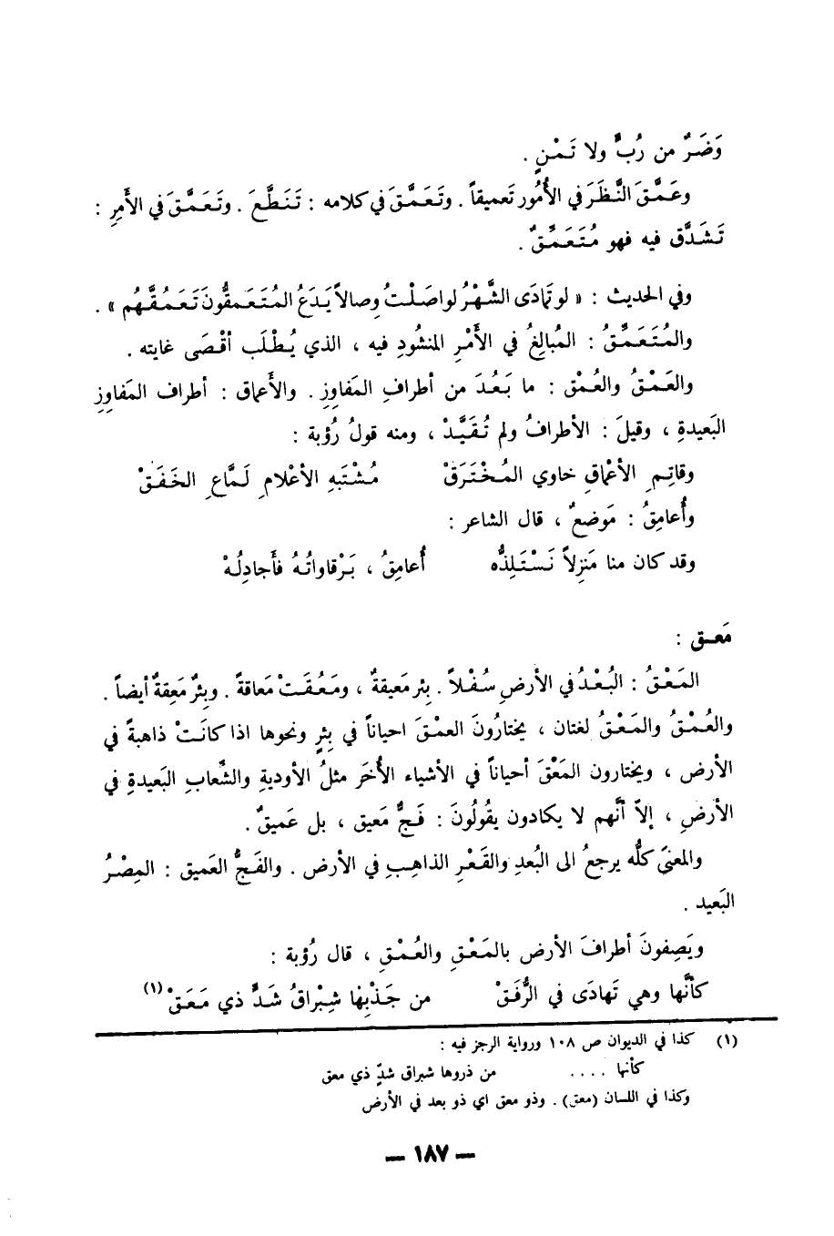 والمُتَعَمِّقُ: المُبالِغُ في الأمرِ المنشُودِ فيه، (الذي يطلب أقْصَى غايته) والعَمْقُ والعُمْق: ما بَعُدَ من أطراف المفاور. والأعماق، أطراف المَفاوِزِ البَعيدةِ، وقيل: الأطرافُ ولم تُقيَّدْ، ومنه قول رؤبة: