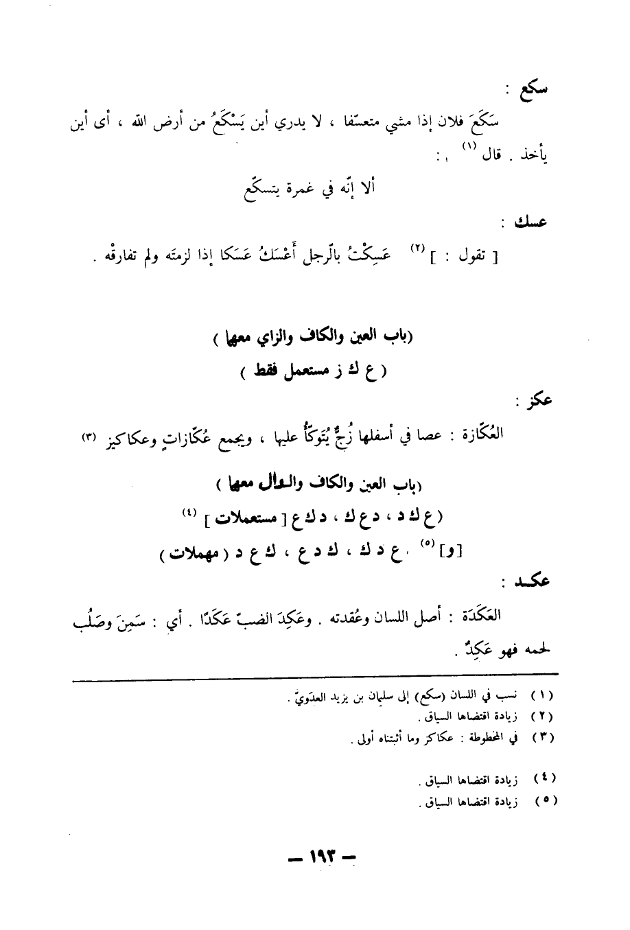 (باب العين والكاف والدال معهما) (ع ك د، د ع ك، د ك ع [مستعملات] «4» [و] «5» ع د ك، ك د ع، ك ع د (مهملات)