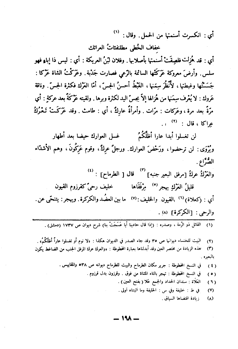 ويُرْوَى: لن ترحضوا، ورَحْضَ العوارك. ورجلٌ عِركٌ، وقومٌ عَرِكُونَ، وهم الأِشدّاء الصُّرَّاع. والعَرْكُ عركُ [مرفق البعير جنبه] «3» قال [الطرماح] : «4»