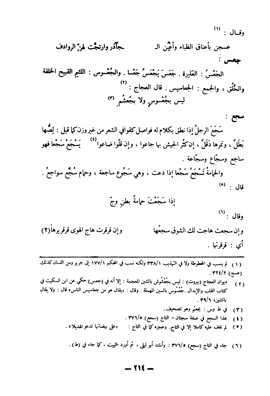 سجع: سَجَعَ الرجلُ إذا نطق بكلام له فواصل كقوافي الشعر من غير وزن كما قيل: لِصُّها بَطَلٌ، وتمرها دَقَلٌ، إن كثُر الجيش بها جاعوا، وإن قلّوا ضاعوا «4» يَسْجَعْ سَجْعا فهو ساجع وسجّاع وسجّاعة. والحمامةُ تَسْجَعُ سَجْعا إذا دعت، وهي سَجُوع ساجعة، وحمام سُجَّع سواجعُ. قال: «5»