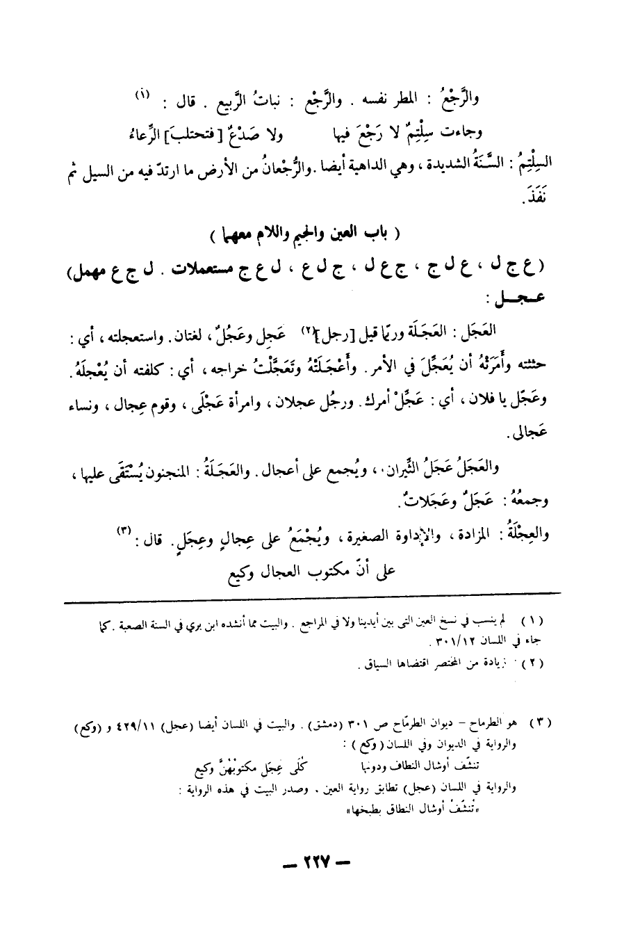 (باب العين والجيم واللام معهما) (ع ج ل، ع ل ج، ج ع ل، ج ل ع، ل ع ج مستعملات، ل ج ع مهمل)