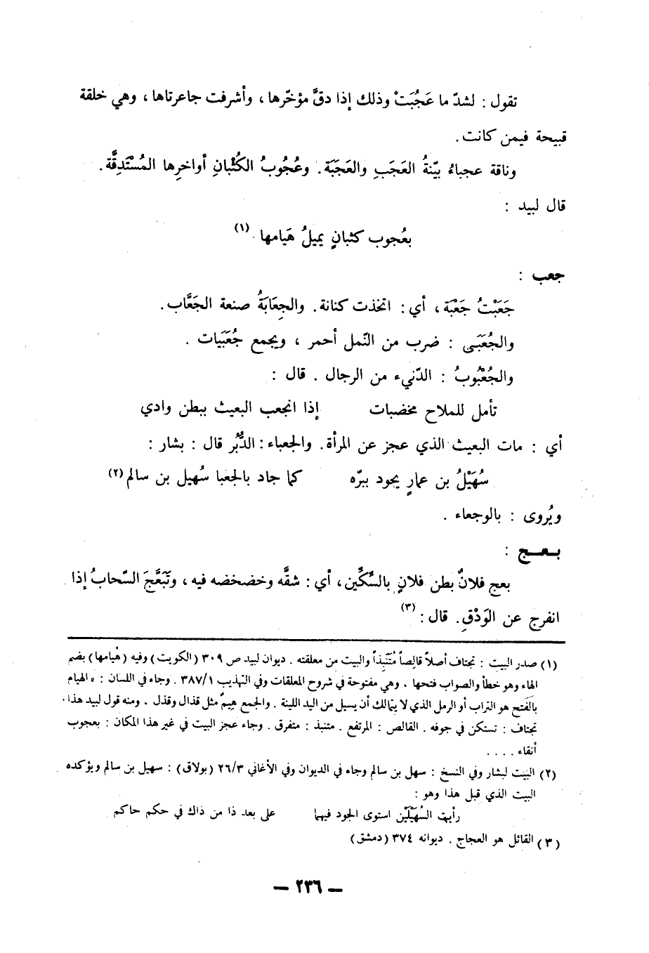 تقول: لشدّ ما عَجُبَتْ وذلك إذا دقَّ مؤخّرها، وأشرفت جاعرتاها، وهي خلقة قبيحة فيمن كانت. وناقة عجباءُ بيّنةُ العَجَبِ والعَجَبَة. وعُجُوبُ الكُثْبانِ أواخرِها المُسْتَدِقَّة. قال لبيد:
