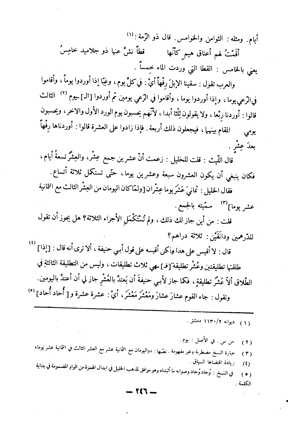 يعني بالخامس: القطا التي وردت الماء خمساً. والعرب تقول: سقينا الإبلَ رِفْهاً أيْ: في كلِّ يوم، وغِبّا إذا أوردوا يوما، وأقاموا في الرّعي يوما، وإذا أوردوا يوما، وأقاموا في الرعي يومين ثم أوردوا [ال] يوم «2» الثالث قالوا: أوردنا رِبْعا، ولا يقولون ثِلْثا أبدا، لأنّهم يحسبون يوم الورد الأول والآخر، ويحسبون يومي المقام بينهما، فيجعلون ذلك أربعة. فإذا زادوا على العشرة قالوا: أوردناها رِفْهاً بعدَ عِشْرٍ. قال اللّيث: قلت للخليل: زعمت أنّ عشرين جمع عِشْر، والعِشْرُ تسعةُ أيام، فكان ينبغي أن يكون العشرون سبعة وعشرين يوما، حتى تستكمل ثلاثة أتساع. فقال الخليل: ثمانيَ عَشَرَ يوما عِشْران [ولمّا كان اليومان من العِشْر الثالث مع الثمانية عشر يوما] «3» سمّيته بالجمع. قلت: من أين جاز لك ذلك، ولم تُسْتَكْمَلِ الأجزاء الثلاثة؟ هل يجوز أن تقول للدّرهمين ودانَقَيْن: ثلاثة دراهم؟ قال: لا أقيس على هذا ولكن أقيسه على قول أبي حنيفة، ألا ترى أنه قال: [إذا] «4» طلقتها تطليقتين وعُشْر تطليقة [ف] هي ثلاث تطليقات، وليس من التطليقة الثالثِة في الطّلاق ألاّ عُشْرُ تطليقةٍ، فكما جاز لأبي حنيفةَ أن يَعتدَّ بالعُشْرِ جاز لي أن أعتدَّ باليومين. وتقول: جاء القوم عشارَ عشارَ ومَعْشَرَ مَعْشَرَ، أي: عشرة عشرة و [أحاد أحاد] «5»