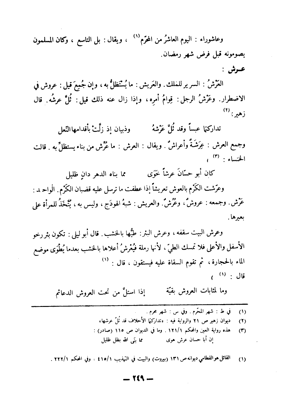 وجمع العرش: عِرَشَةٌ وأعراشٌ. ويقال: العرش: ما عُرِّش من بناء يستظلِّ به. قالت الخنساء: «3»