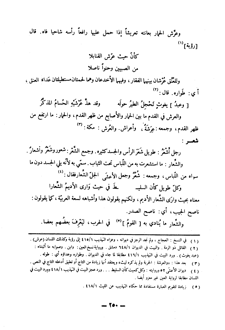 (3) بعد هذا: والعرشة: الحربةو لم يذكره ليث ويعتقد أنها زيادة من التاج أو تعليق أدخله التاج في النص.