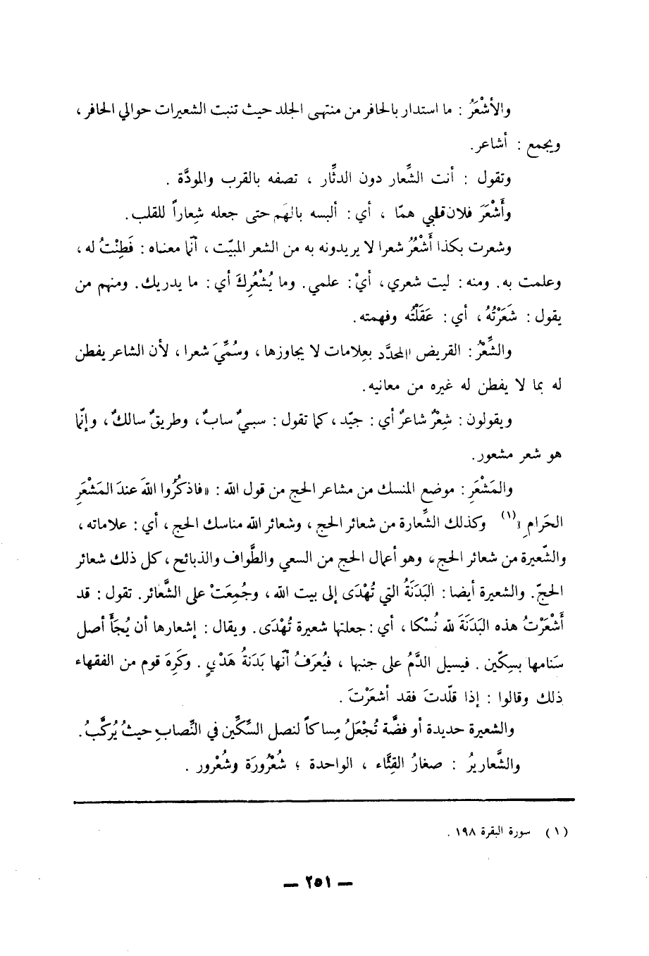 والأشْعَرُ: ما استدار بالحافر من منتهى الجلد حيث تنبت الشعيرات حوالي الحافر، ويجمع: أشاعر. وتقول: أنت الشِّعار دون الدثِّار، تصفه بالقرب والمودَّة. وأَشْعَرَ فلان قلبي همّا، أي: ألبسه بالهَم حتى جعله شِعاراً للقلب. وشعرت بكذا أَشْعُرُ شعرا لا يريدونه به من الشعر المبّيت، أنّما معناه: فَطِنْتُ له، وعلمت به. ومنه: ليت شعري، أيْ: علمي. وما يُشْعُرِكَ أي: ما يدريك. ومنهم من يقول: شَعَرْتُهُ، أي: عَقَلْتُه وفهمته. والشِّعْرُ: القريض المحدَّد بعِلامات لا يجاوزها، وسُمِّيَ شعرا، لأن الشاعر يفطن له بما لا يفطن له غيره من معانيه. ويقولون: شِعْرٌ شاعرٌ أي: جيّد، كما تقول: سبيٌ سابٌ، وطريقٌ سالكٌ، وإنّما هو شعر مشعور. والمَشْعَرِ: موضع المنسك من مشاعر الحج من قول الله: فَاذْكُرُوا اللَّهَ عِنْدَ الْمَشْعَرِ الْحَرامِ «1» وكذلك الشِّعارة من شعائر الحج، وشعائر الله مناسك الحج، أي: علاماته، والشّعيرة من شعائر الحج، وهو أعمال الحج من السعي والطَّواف والذبائح، كل ذلك شعائر الحجّ. والشعيرة أيضا: البَدَنَةُ التي تُهْدَى إلى بيت الله، وجُمِعَتْ على الشَّعائر. تقول: قد أَشْعَرْتُ هذه البّدَنَةَ لله نُسْكا، أي: جعلتها شعيرة تُهْدَى. ويقال: إشعارها أن يُجَأَ أصل سَنامها بسِكّين. فيسيل الدَّمُ على جنبها، فيُعَرفُ أنّها بَدَنُة هَدْيٍ. وكَرِهَ قوم من الفقهاء ذلك وقالوا: إذا قلّدتَ فقد أشعَرْتَ. والشعيرة حديدة أو فضَّة تُجْعَلُ مِساكاً لنصل السِّكِّين في النِّصابِ حيثُ يُركَّبُ. والشَّعاريرُ: صغارُ القِثَّاء، الواحدة، شُعْرُورةَ وشعرور.