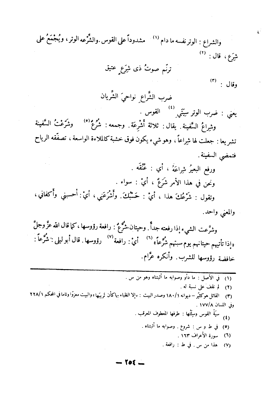 يعني: ضرب الوتر سِيَتَيِ «4» القوس. وشِراعُ السَّفينة. يقال: ثلاثة أَشْرِعَة. وجمعه: شُرُعٌ «5» وشَرّعْتُ السَّفينة تشريعا: جعلت لها شِراعاً، وهو شيء يكون فوق خشبة كالملاءة الواسعة، تصفّقه الرياح فتمضي السفينة. ورفع البعيرُ شِراعَهُ، أي: عُنُقَه. ونحن في هذا الأمر شَرَعٌ، أيْ: سواء. وتقول: شَرْعُكَ هذا، أيْ: حَسْبُكَ. وأَشْرَعَنِي، أيْ: أحسبني وأَكفاني، والمعني واحد. وشَّرعت الشيء إذا رفعته جداً. وحيتان شُرَّعٌ: رافعة رءوسها، كما قال الله عز وجل إِذْ تَأْتِيهِمْ حِيتانُهُمْ يَوْمَ سَبْتِهِمْ شُرَّعاً