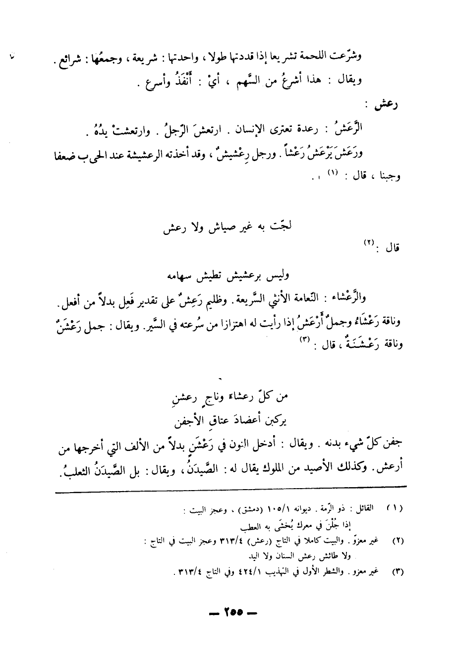 رعش: الرَّعَشُ: رعدة تعترى الإنسان. ارتعشَ الرّجلُ. وارتعشتْ يدُهُ. ورَعَشَ يَرْعَشُ رَعْشاً. ورجل رِعْشيشٌ، وقد أخذته الرعشيشة عند الحرب ضعفا وجبنا. قال: «1» .
