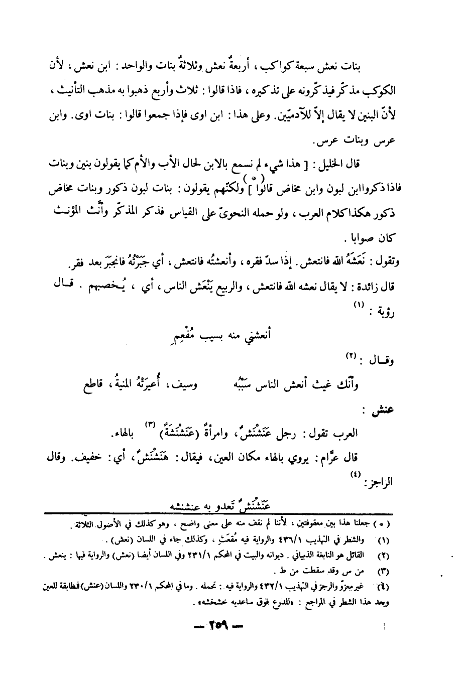 بنات نعش سبعة كواكب، أربعةٌ نعش وثلاثةٌ بنات والواحد: ابن نعش، لأن الكوكب مذكّر فيذكّرونه على تذكيره، فإذا قالوا: ثلاث وأربع ذهبوا به مذهب التأنيث، لأنّ البنين لا يقال إلاّ للآدميّين. وعلى هذا: ابن اوى فإذا جمعوا قالوا: بنات اوى. وابن عرس وبنات عرس. قال الخليل: [هذا شيء لم نسمع بالابن لحال الأب والأم كما يقولون بنين وبنات فإذا ذكروا ابن لبون وابن مخاض قالوا] «1» ولكنهم يقولون: بنات لبون ذكور وبنات مخاض ذكور هكذا كلام العرب، ولو حمله النحويّ على القياس فذكر المذكّر وأنَّث المؤنث كان صوابا. وتقول: نَعَشَهُ الله فانتعش. إذا سدّ فقره، وأنعشُته فانتعش، أي جَبَرْتُهُ فانجبَرَ بعد فقر. قال زائدة: لا يقال نعشه الله فانتعش، والربيع يَنْعَش الناس، أي، يُخصبهم. قال رؤبة: «2»