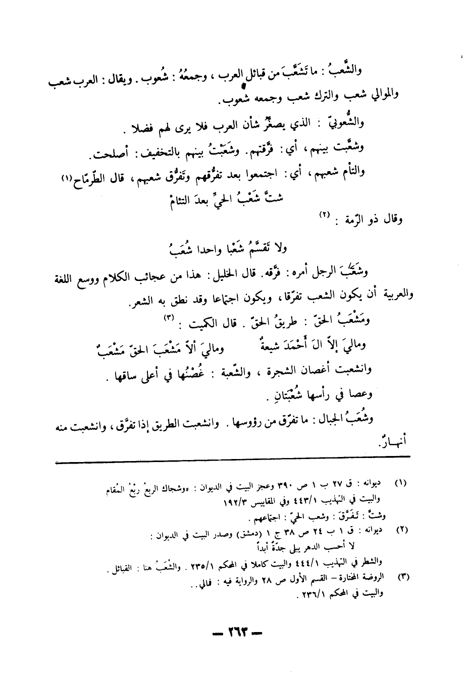 والشَّعبُ: ما تَشَعَّبَ من قبائل العرب، وجمعُهُ: شُعوب. ويقال: العرب شعبٌ والموالي شعبٌ والترك شعبٌ وجمعه شعوب. والشُّعوبيّ: الذي يصغِّرُ شأن العرب فلا يرى لهم فضلاً. وشعَّبت بينهم، أي: فرَّقتهم. وشَعَبْتُ بينهم بالتخفيف: أصلحت. والتأم شعبهم، أي: اجتمعوا بعد تفرُّقهم وتَفرُّق شعبهم، قال الطرماح «1»