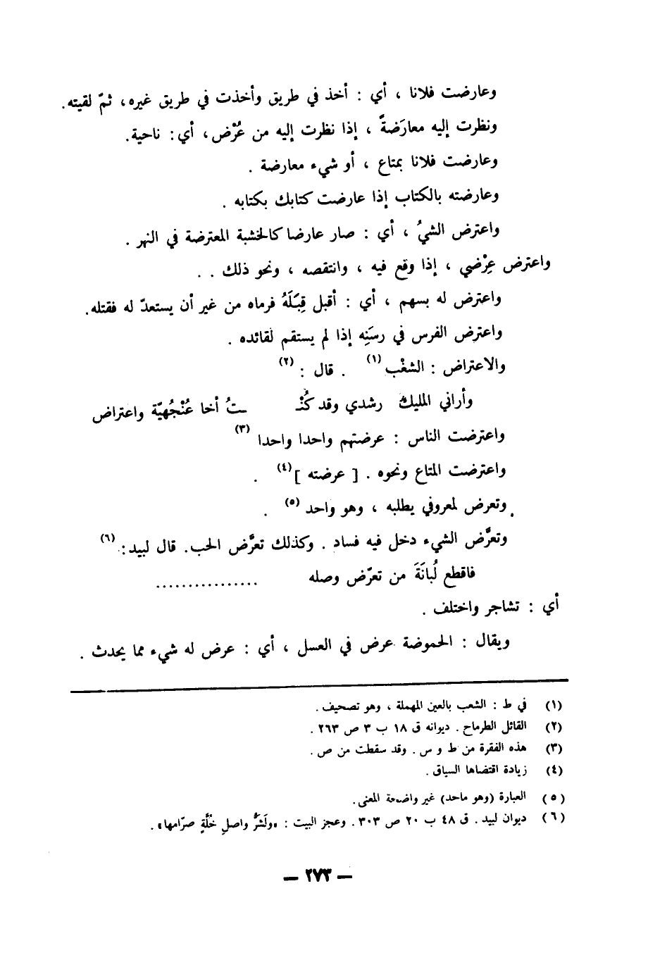 وعارضت فلاناً، أي: أخذ في طريق وأخذت في طريق غيره، ثمّ لقيته. ونظرت إليه معارَضةً، إذا نظرت إليه من عُرْض، أي: ناحية. وعارضت فلاناً بمتاع، أو شيء معارضة. وعارضته بالكتاب إذا عارضت كتابك بكتابه. واعترض الشيء، أي: صار عارضاً كالخشبة المعترضة في النهر. واعترض عِرْضي، إذا وقع فيه، وانتقصه، ونحو ذلك.. واعترض له بسهم، أي: أقبل قِبَلَه فرماه من غير أن يستعدّ له فقتله. واعترض الفرس في رسَنِه إذا لم يستقم لقائده. والاعتراض: الشغْب «1» . قال: «2»