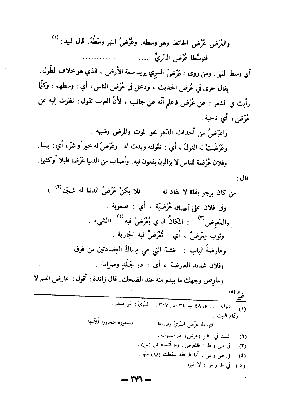 أي وسط النهر. ومن روى: عَرْضَ السرِي يريد سعة الأرض، الذي هو خلاف الطوّل. يقال جرى في عُرض الحديث، ودخل في عُرْض الناس، أي: وسطهم، وكلّما رأيت في الشعر: عن عُرْض فاعلم أنّه عن جانب، لأنّ العرب تقول: نظرت إليه عن عُرْض، أي ناحية. واعَرَضُ من أحداث الدّهر نحو الموت والمرض وشبهه. وعَرَضَتْ له الغولُ، أي: تغّولته وبدت له. وعَرَضَ له خير أو شرّ، أي: بدا. وفلان عُرْضة للناس لا يزالون يقعون فيه. وأصاب من الدنيا عَرَضاً قليلاً أو كثيراً. قال: