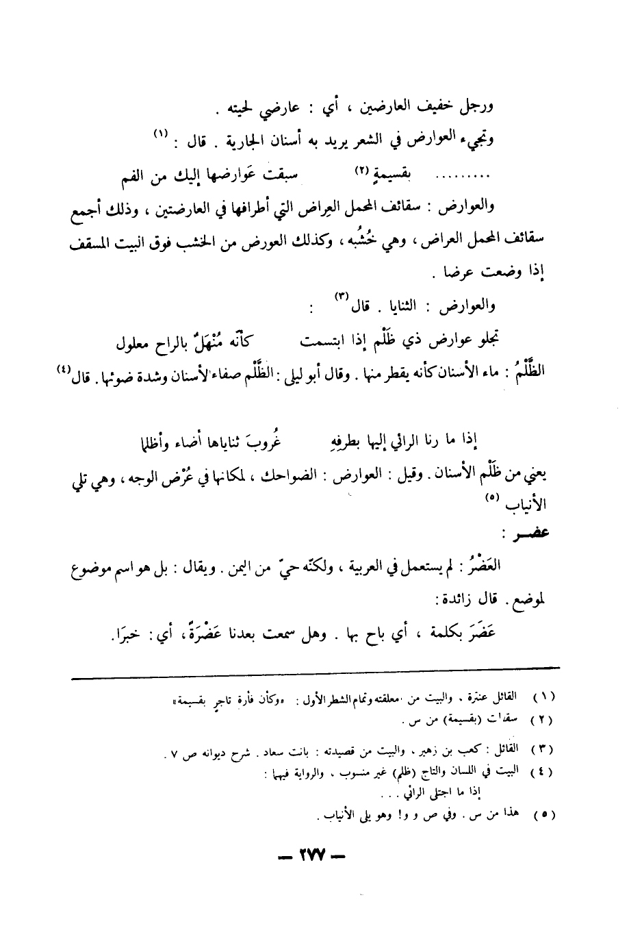 والعوارض: سقائف المحمل العِراض التي أطرافها في العارضتين، وذلك أجمع سقائف المحمل العراض، وهي خُشُبه، وكذلك العورض من الخشب فوق البيت المسقف إذا وضعت عرضاً. والعوارض: الثنايا. قال «3» :