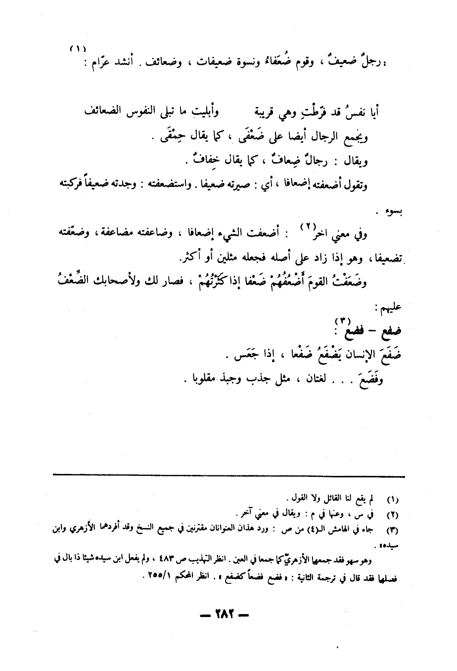 (3) جاء في الهامش ال (4) من ص: ورد هذان العنوانان مقترنين في جميع النسخ وقد أفردهما الأزهري وابن سيده. وهو سهو فقد جمعهما الأزهري كما جمعا في العين. انظر التهذيب ص 483، ولم يفعل ابن سيده شيئا ذا بال في فصلهما فقد قال في ترجمة الثانية: فضع فضعا كضفع. انظر المحكم 1/ 255.