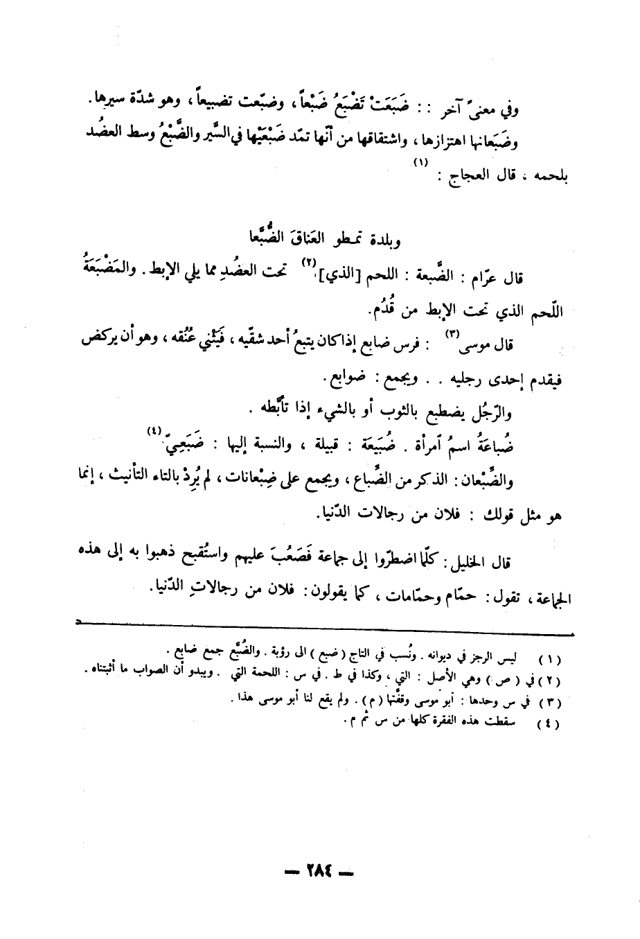 (1) ليس الرجز في ديوانه. ونسب في التاج (ضبع) إلى (رؤبة) . والضبع جمع ضابع.