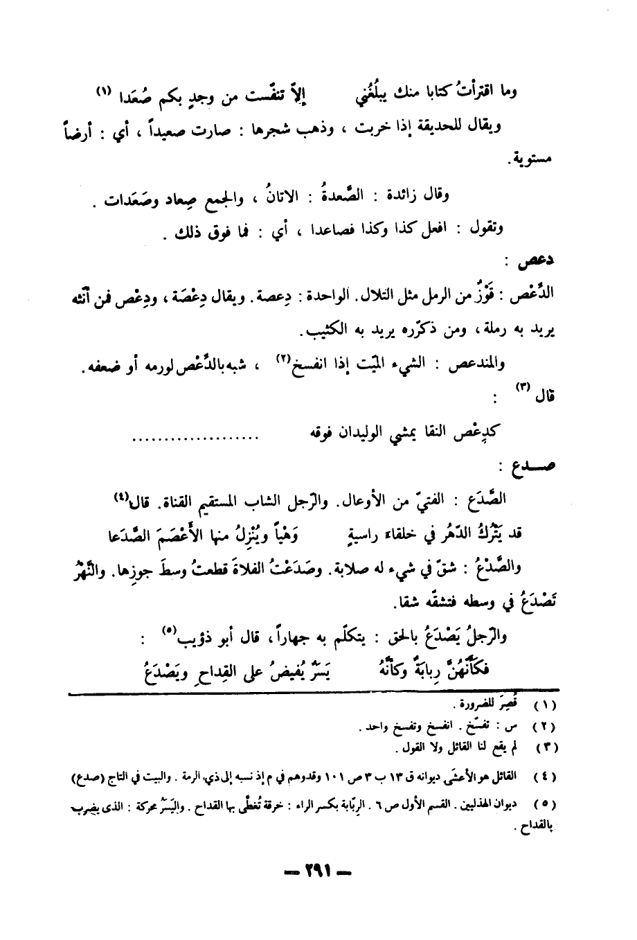 دعص: الدِّعْص: قَوْزٌ من الرمل مثل التلال. الواحدة: دِعصة. ويقال دِعْصَة، ودِعْص فمن أنّثه يريد به رملة، ومن ذكرره يريد به الكثيب. والمندعص: الشيء الميّت إذا انفسخ «2» ، وشبه بالدِّعْص لورمه أو ضعفه. قال «3» :