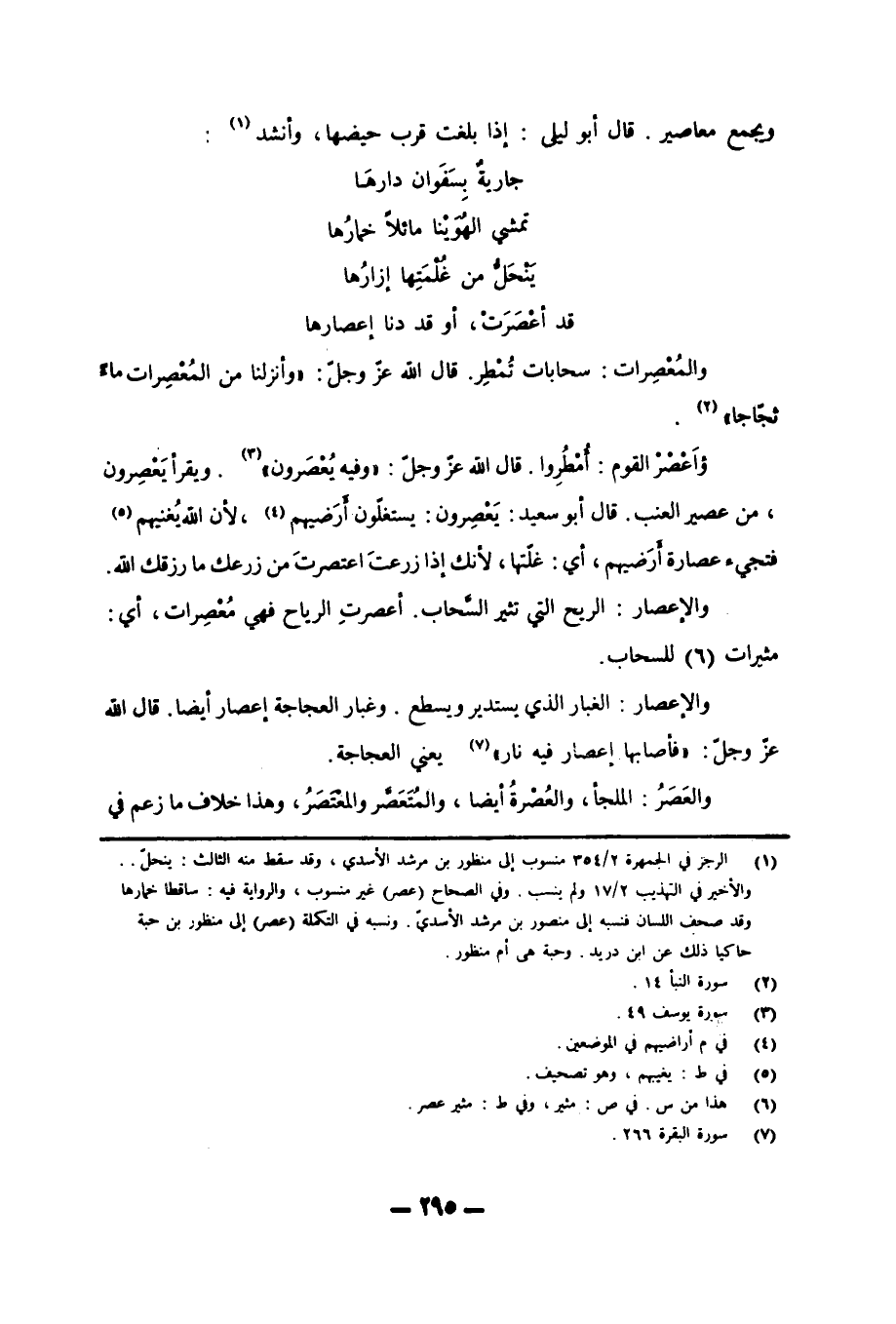 «7» يعني العجاجة. والعَصَرُ: الملجأ، والعُصْرةُ أيضاً، والمُتَعَصَّرُ والمعْتَصَرُ، وهذا خلاف ما زعم في